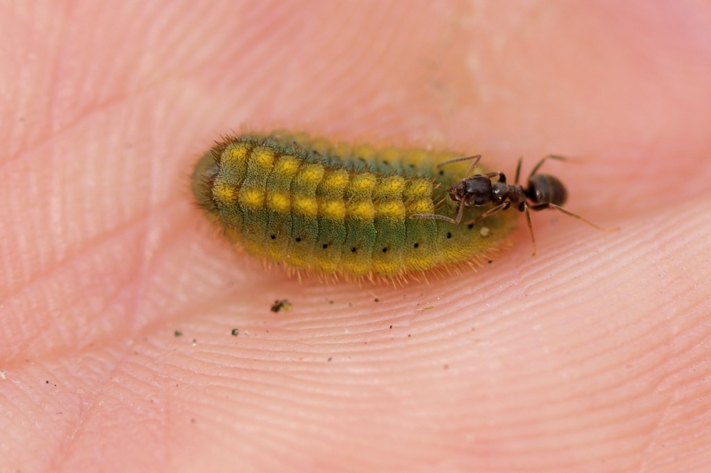 Many species of blue butterfly (family Lycaenidae) have amazing lifecycles where their caterpillars interact with ants. For example, this caterpillar of a chalkhill blue is being tended to by a worker ant.