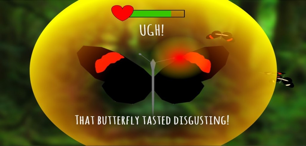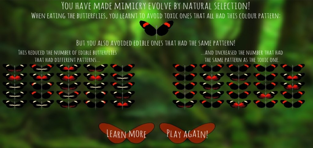 In this game, you are the predator again, choosing butterflies to eat. BUT there is one type of butterfly that is poisonous that you have to avoid. Watch as the game goes on how the pattern of the poisonous species spreads, so it looks like almost all the butterflies are poisonous. HOWEVER, some of the butterflies are cheating. They have the same patterns on their wings as the poisonous species but are actually completely harmless. Over time this pattern becomes more common as the predator (you) avoids it.