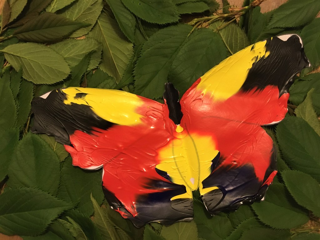 Want to have a symmetrical pattern, with both sides of your butterfly looking the same? Why not try a paint blot butterfly print? You will need to put some newspaper down as this can get messy. Put some splodges of paint (poster paint works well for this) on one side of your butterfly. Then fold your paper in half along the body and press down. Peel the two sides of your paper apart and you should have matching wings. Leave to dry.