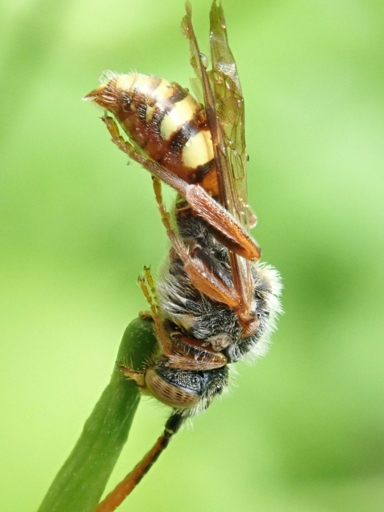 A remarkable story here. This unfortunate wasp, Nomada flava, has become infected with a virus that changed its behaviour and made it cling upside down at the top of a tall piece of grass. The wasp is (or will be) dead and the fungus gets a nice high point from which to disperse its spores into the wind.