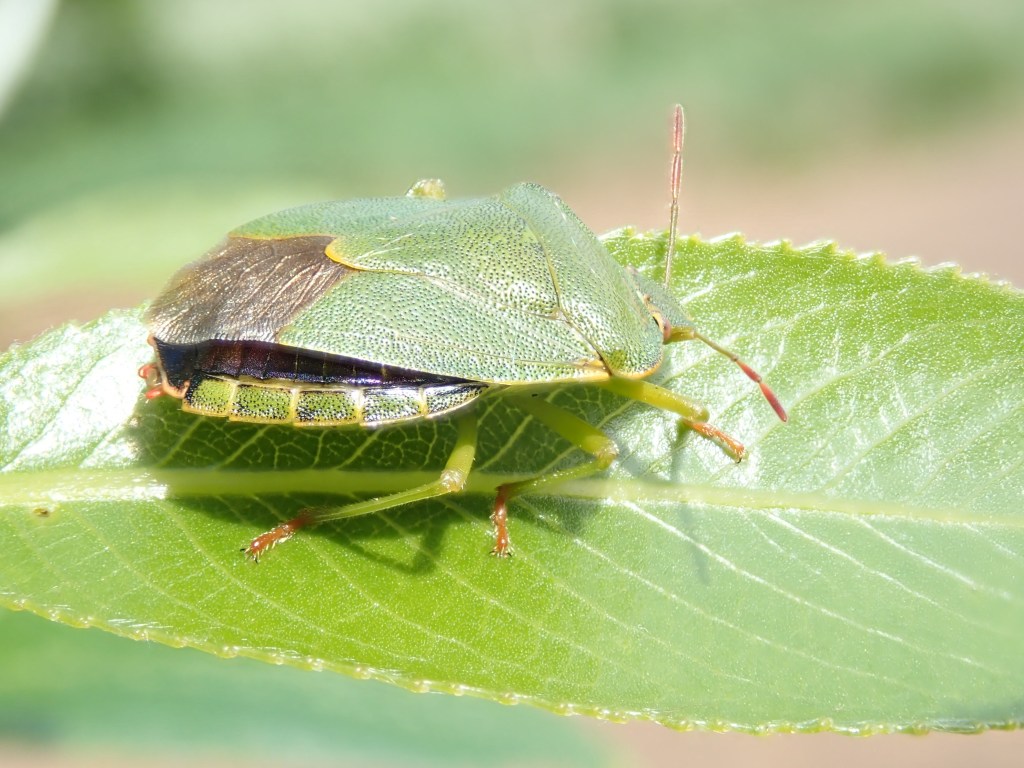 The common green shieldbug,Palomena prasina. These feed on a variety of plants and, although quite cryptic, if you look carefully at vegetation on a sunny day you stand a good chance of seeing one.