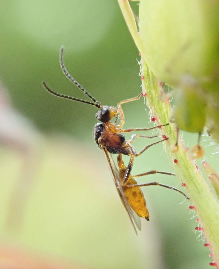 A tiny parasitic wasp looking for prey in a colony of aphids.