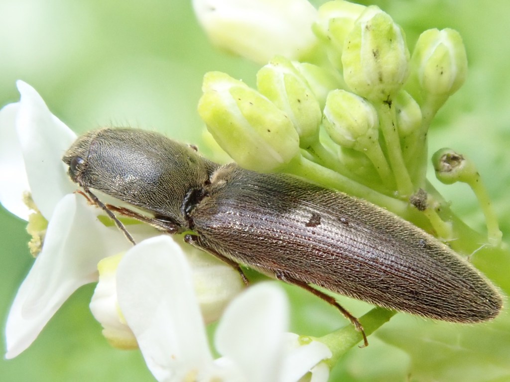 A click beetle. The division between the thorax and abdomen is strongly emphasised, and for a reason! When threatened, these beetles and suddenly and violently jackknife the two parts of the body with a sharp ‘click’, flipping themselves away from danger.