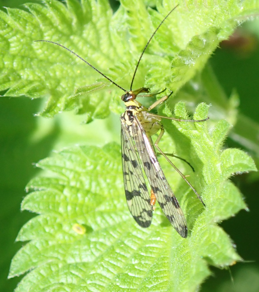 A female scorpionfly. These spectacular insects are quite common in hedgerows and I often see them on nettles and brambles. In males, the end of the abdomen curls up and ends in red claspers, used for mating and harmless but quite like a scorpion’s tail. The adults scavange dead insects and even rob spiders’ webs.