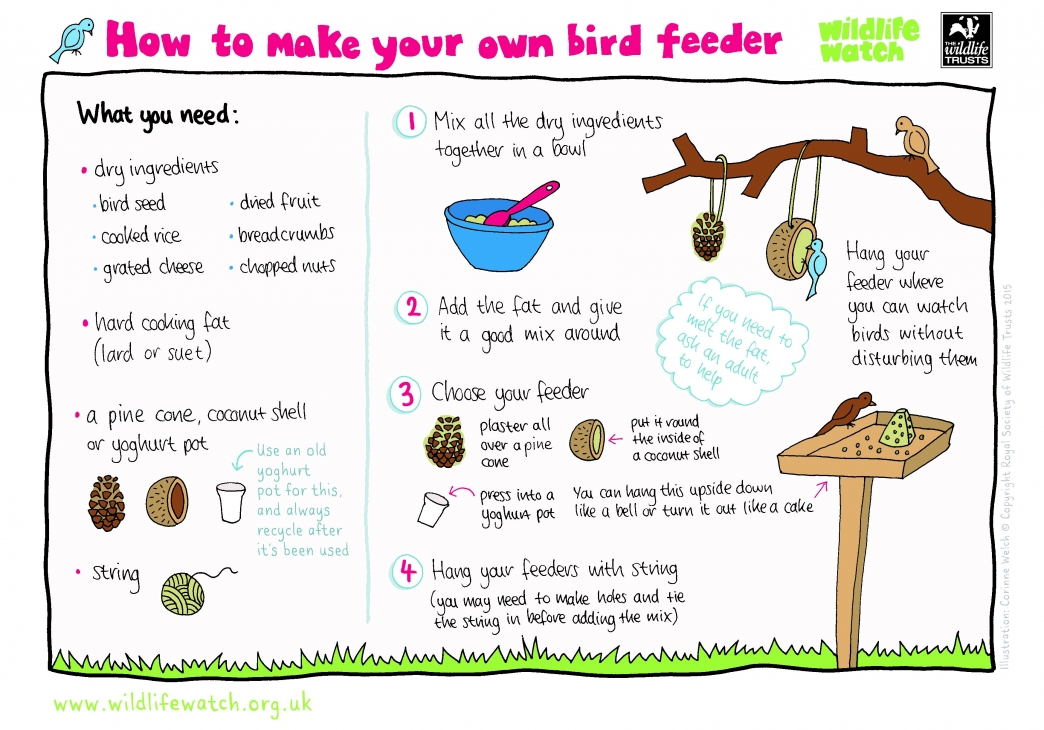 Is there anything you could do to help the birds near you? Perhaps you could put out water for them in you green space? How about some food? Or make sure there are plants that caterpillars like to eat (providing insect-eating birds with a source of food). You can find some tips in our last Nature Classroom post. The Wildlife Trusts have some great tips on helping our local wildlife, including this great how-to on making a bird feeder: