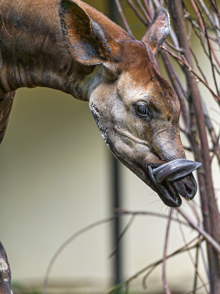The okapi is the only living relative of giraffes and looking closer you can see the similarities. It has camouflaging body patterns, large ears and the males have stout horns above the eyes (ossicones).
