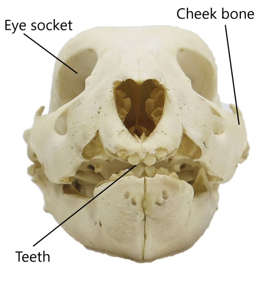 Mice, rats, squirrels and guinea pigs are all rodents. Rodents have a big set of incisor teeth at the front of the mouth that keep growing. These are perfect for gnawing, their hard food wearing them down. The enamel on the front of the teeth in some rodents contains lots of iron, giving it an orange colour and making it extra hard. The slightly softer tooth behind wears down making a chisel shape. But the gnawing teeth are not the only feeding adaptation in rodents. Take a look at the jaw joint and it is a groove that’s open front to back letting the lower jaw move forwards to gnaw with their incisors, or back to grind their food with their molars. You can explore the skull of a guinea pig here: