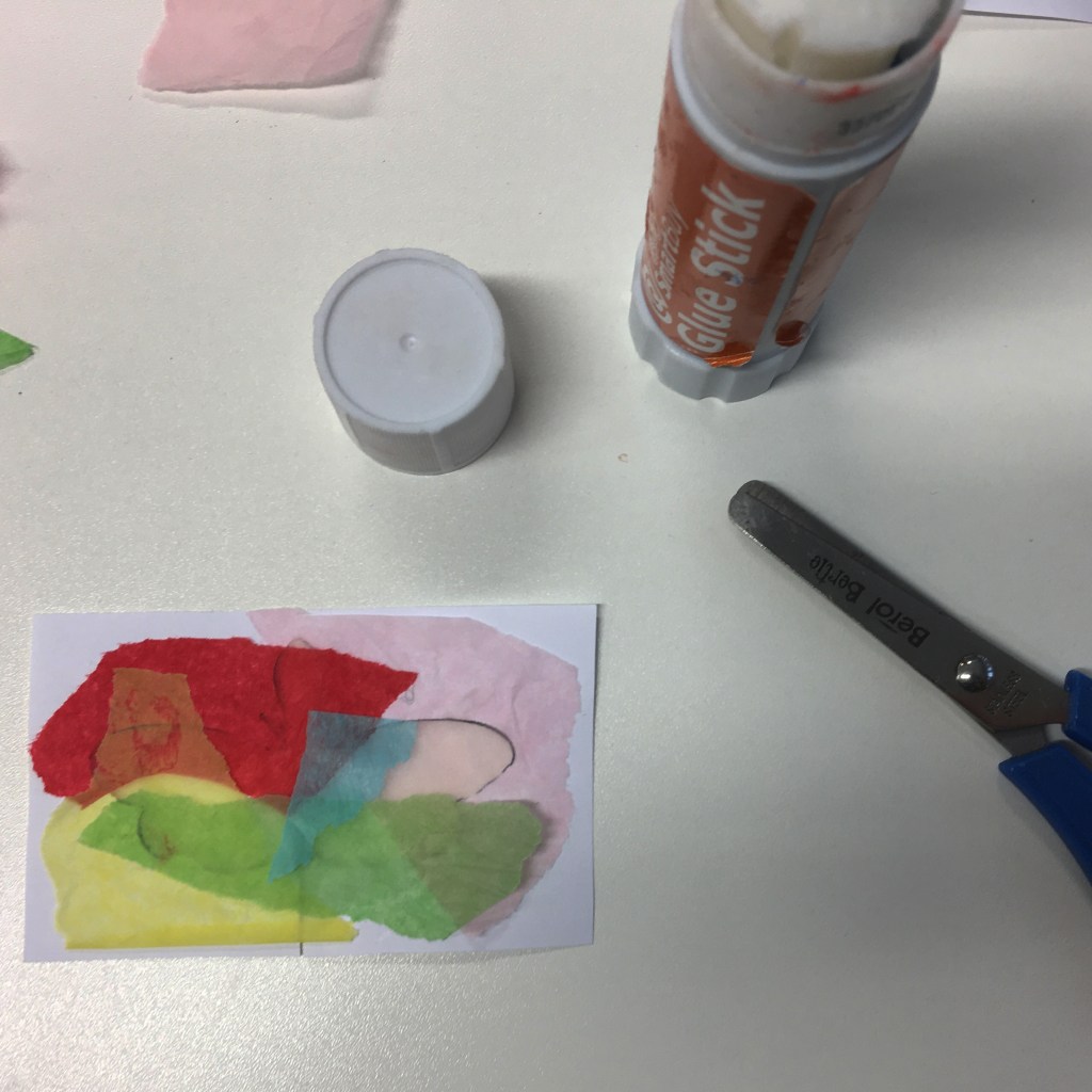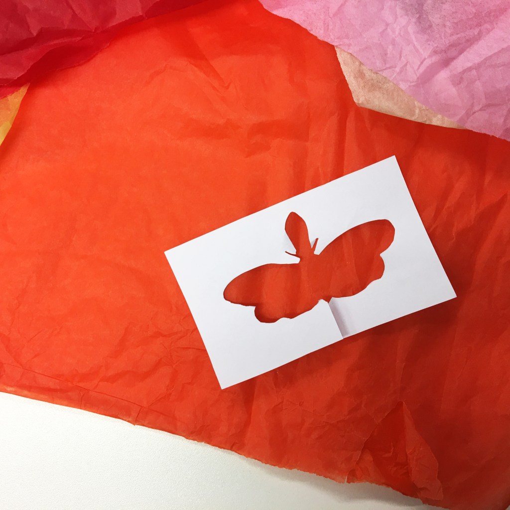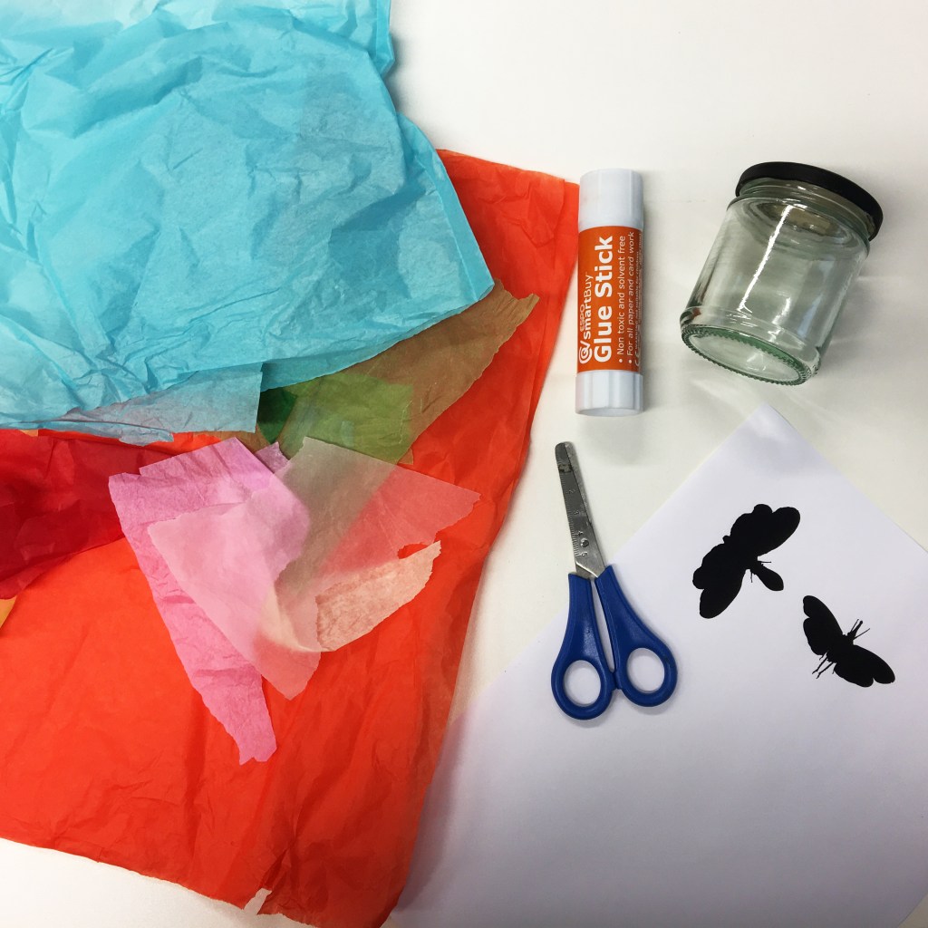 - Create a colourful collage using the tissue paper over the lantern bug shaped hole.