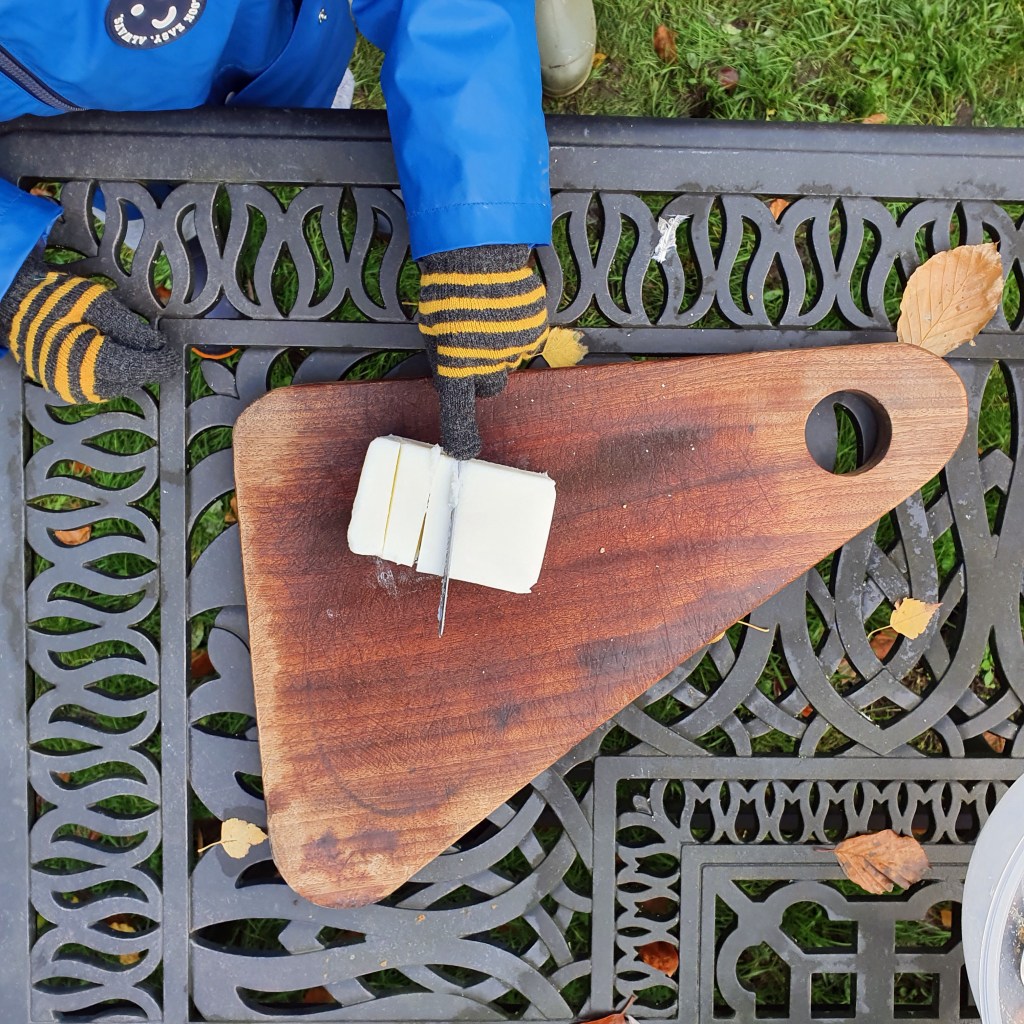We have a bird feeder that fits the balls, so we put them in that. If you don’t have one, you could use empty yogurt pots. To hang it you need to get a length of string and tie a knot at the end. Poke a hole in the base of the pot and thread the string through. Add the mixture right to the top of the pot, pressing it in. You can then hang the pot from a tree, bird table or balcony.