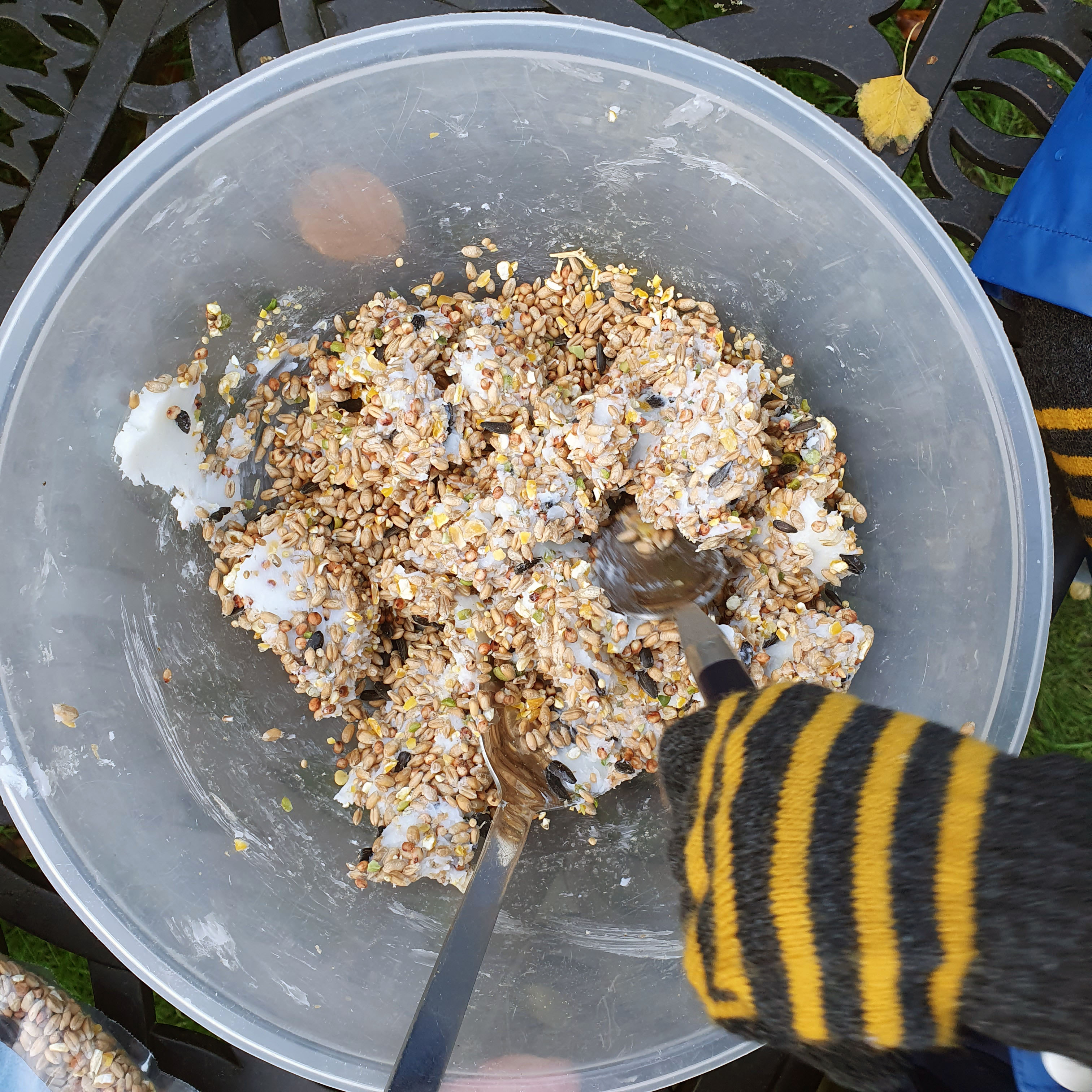 Tip the lard chunks into the mixing bowl and add bird seed. Mix together with the spoon. You are meant to use 1 part lard, to 2 parts bird seed but we just kept adding bird seed until we thought it was enough.