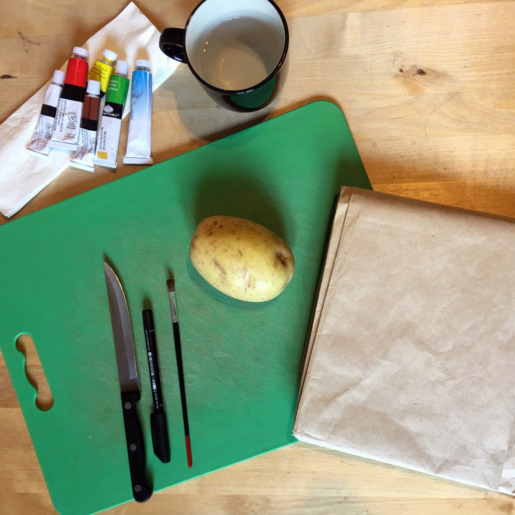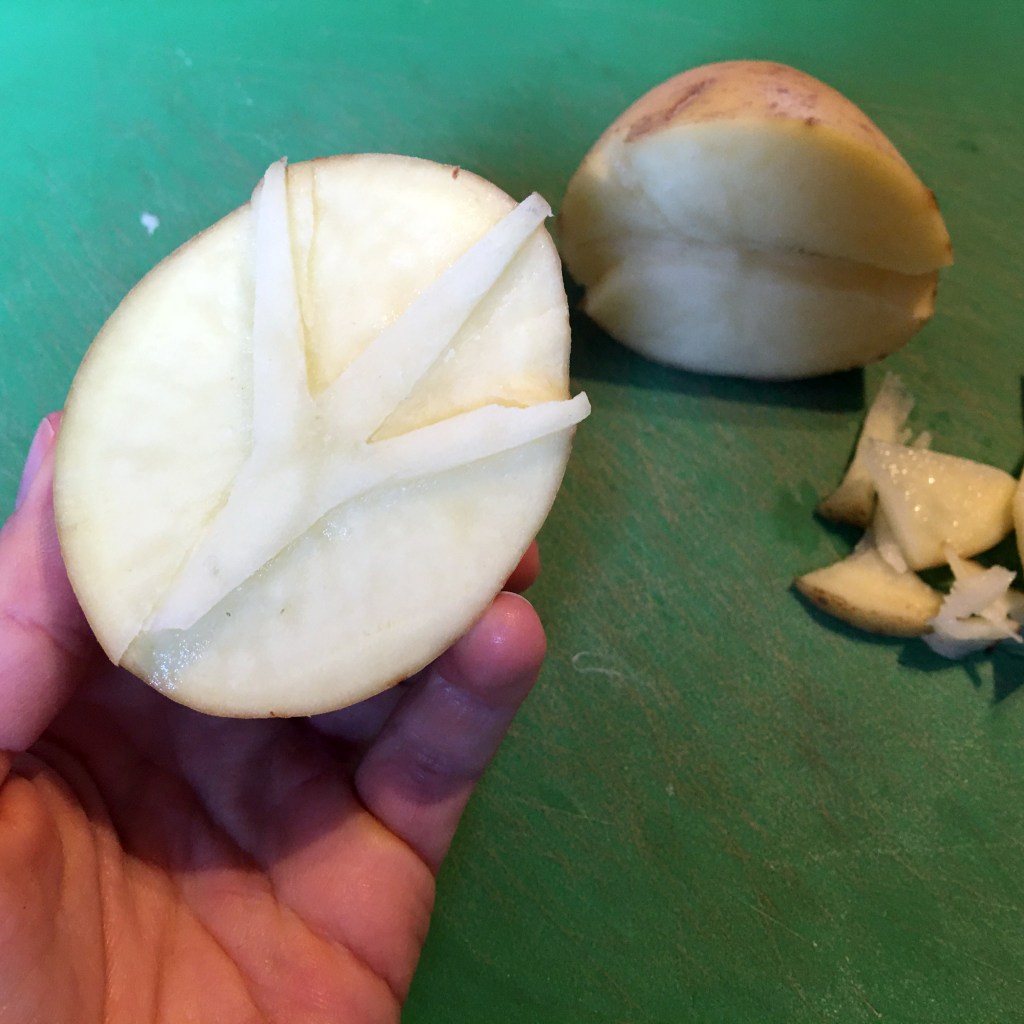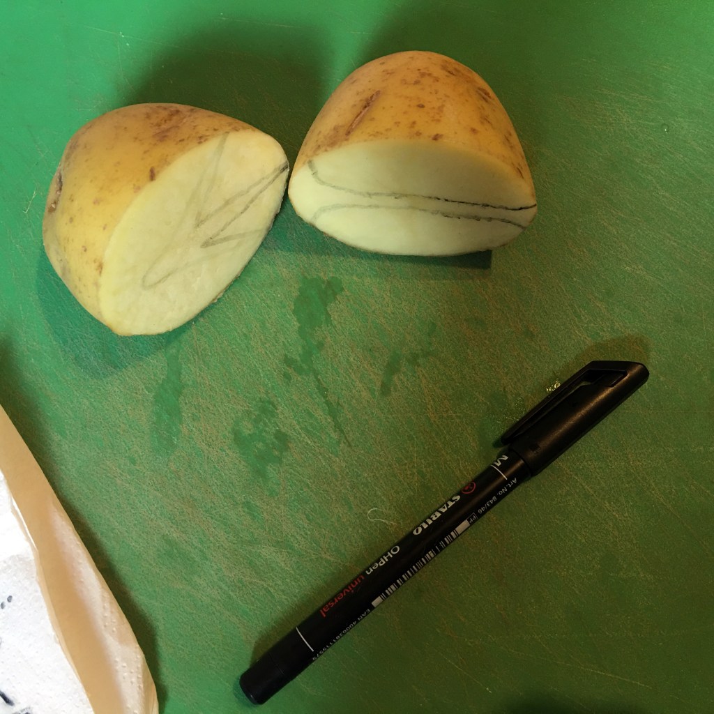 - Take a pen and draw your footprint design onto the flat side of your potato.