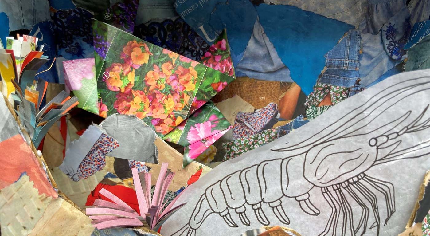 To make our recycled rockpool, we used old magazines to collage the background of sky, water and rocks. To make it three-dimensional, we put some layers of rocks made from corrugated card at the front and stuck to the middle of the base of the box.